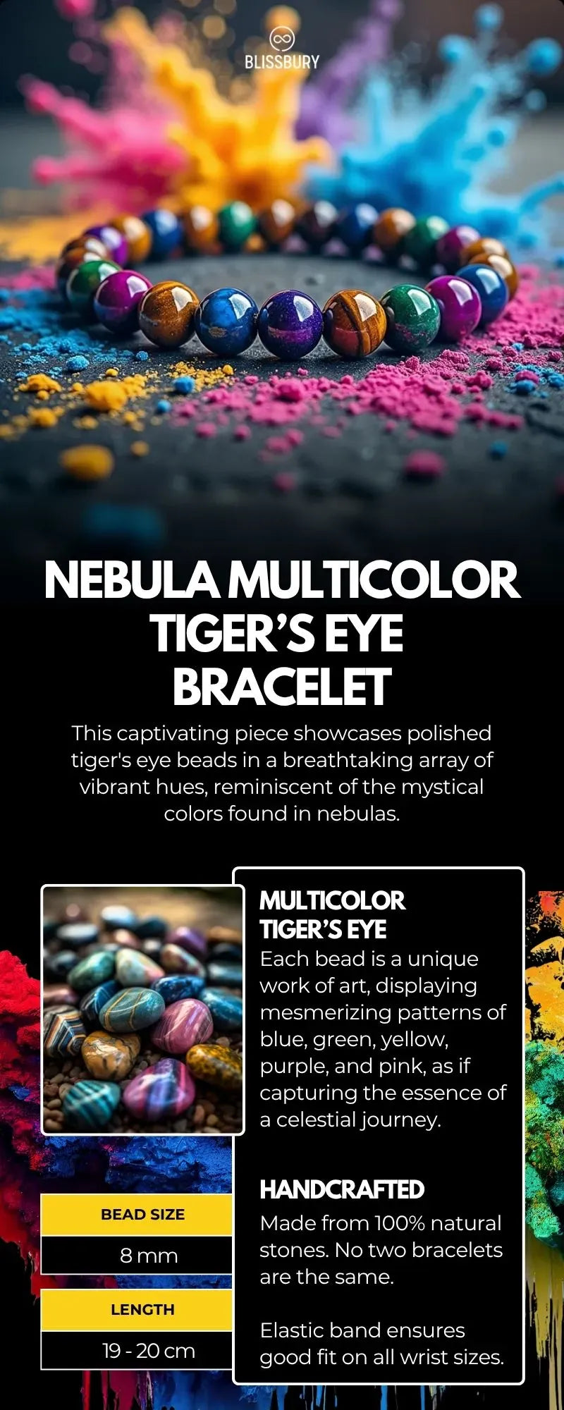 Step into the enchanting realm of the cosmos with our Nebula Tiger's Eye Bracelet. This captivating piece showcases polished tiger's eye beads in a breathtaking array of vibrant hues, reminiscent of the mystical colors found in nebulas.