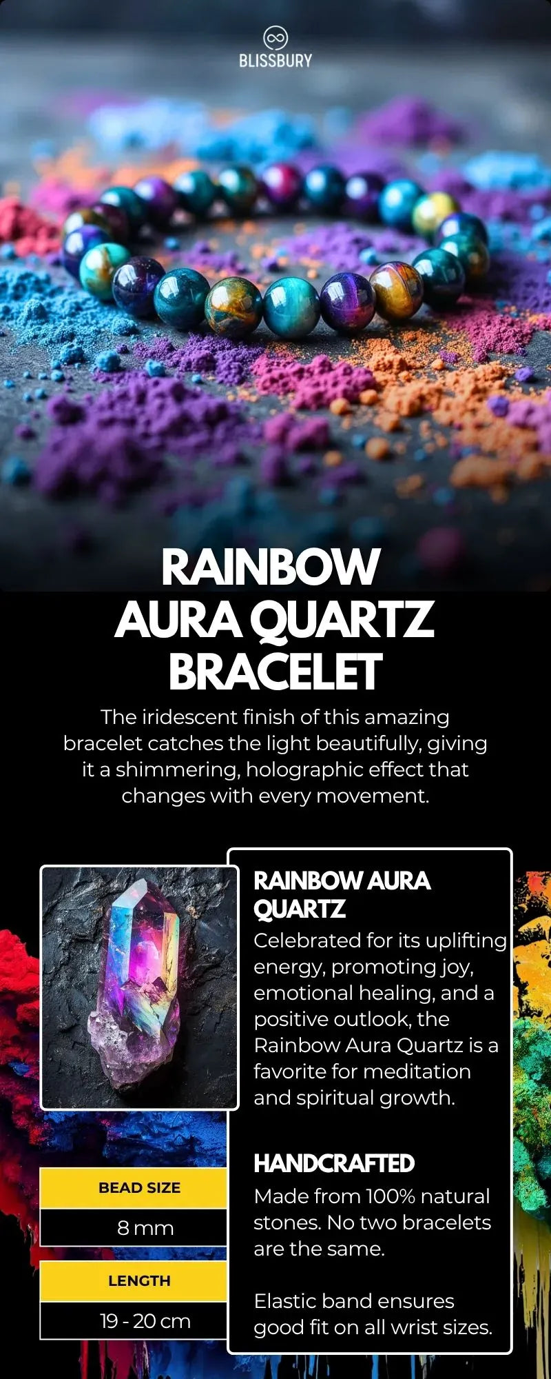 Whether you're dressing up for a night out or adding a touch of elegance to your everyday look, the Rainbow Aura Quartz Bracelet is the perfect choice.