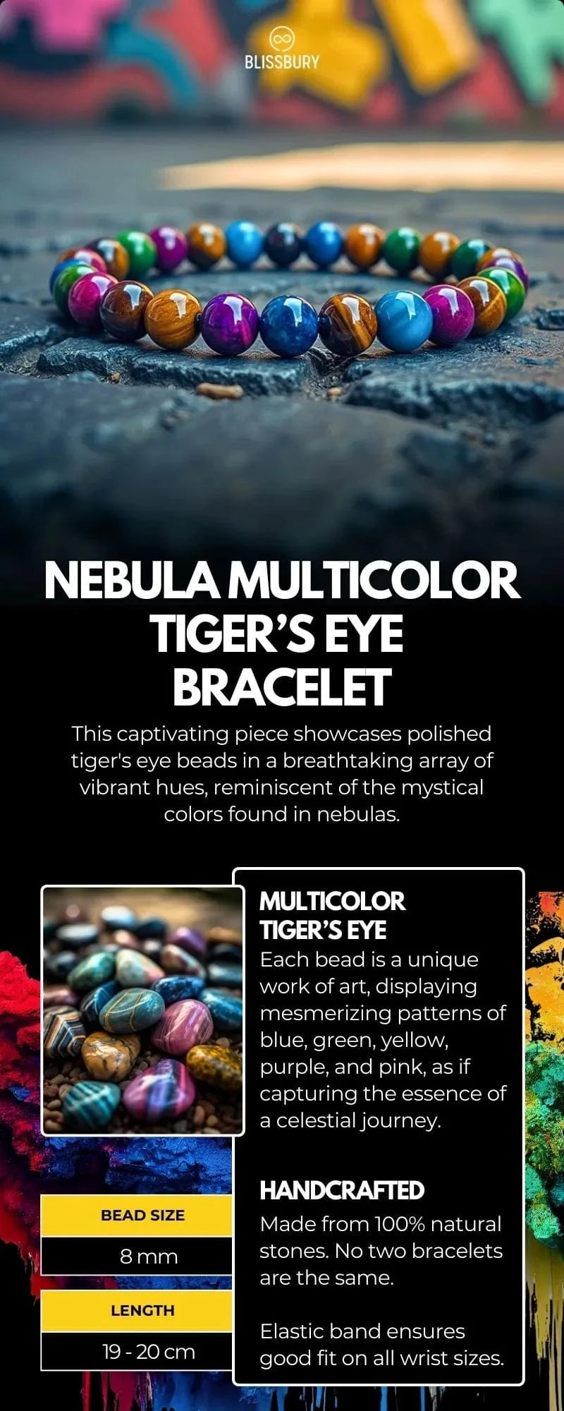Step into the enchanting realm of the cosmos with our Nebula Tiger's Eye Bracelet. This captivating piece showcases polished tiger's eye beads in a breathtaking array of vibrant hues, reminiscent of the mystical colors found in nebulas.