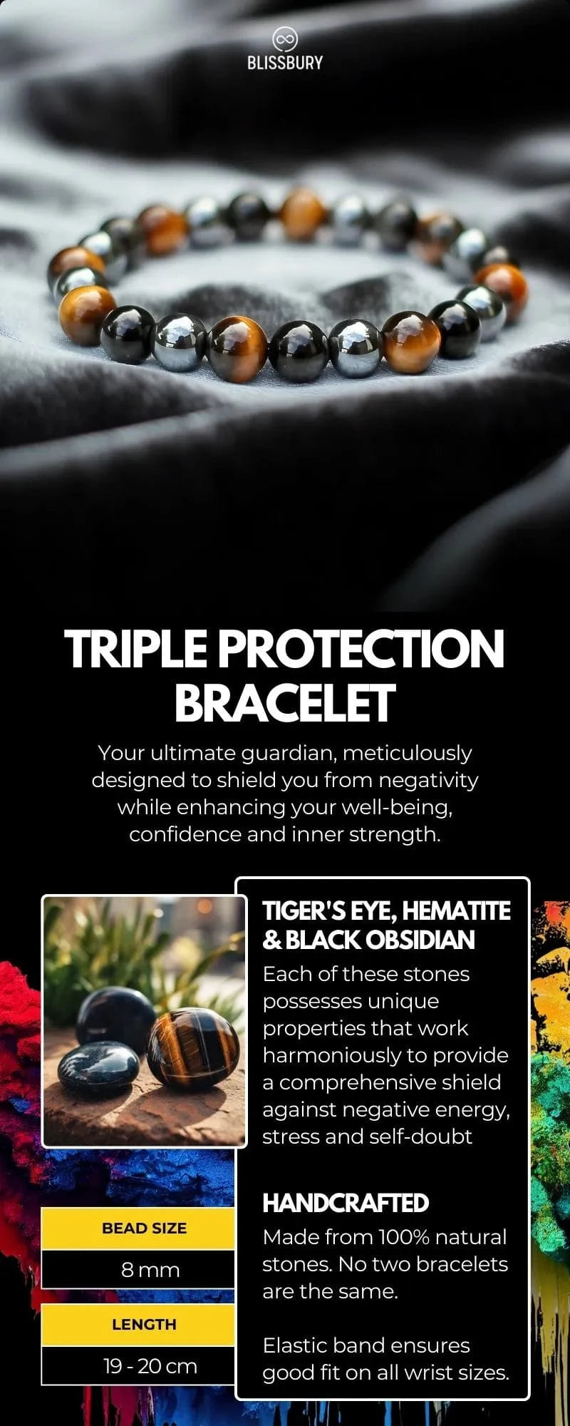 The Triple Protection Bracelet is handcrafted using three potent gemstones: Tiger's Eye, Black Obsidian and Hematite.