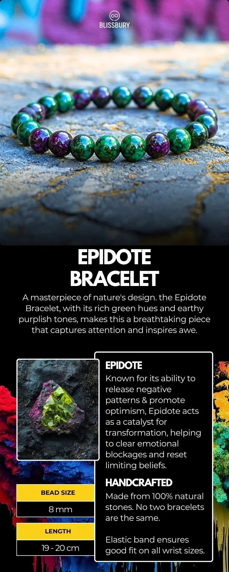 Chaque pierre d'épidote est choisie pour ses nuances vertes et violettes vibrantes et sa riche texture de base, faisant de chaque bracelet une expression unique d'élégance naturelle.