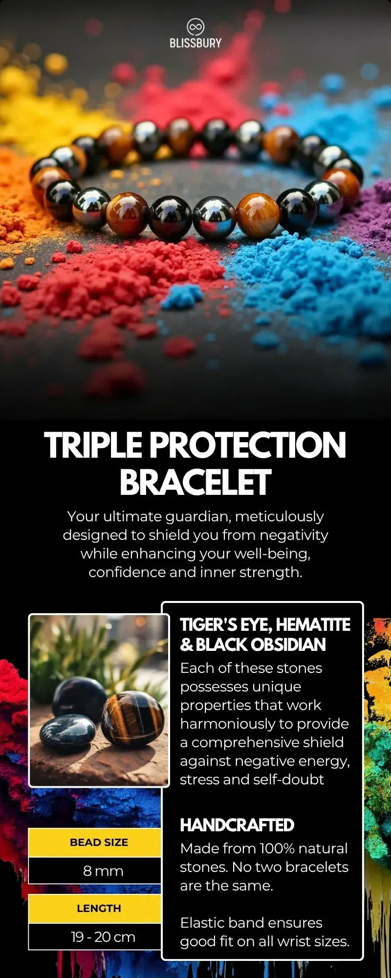 Présentation du bracelet Triple Protection - votre gardien ultime, méticuleusement conçu pour vous protéger de la négativité tout en améliorant votre bien-être, votre confiance et votre force intérieure.