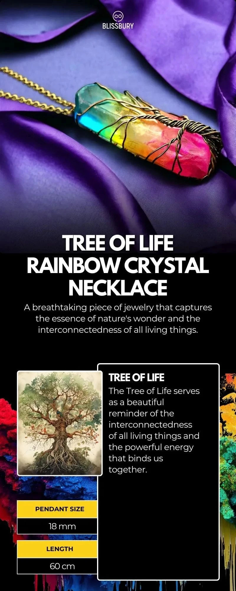 Adoptez la magie et les merveilles du collier en cristal arc-en-ciel Tree of Life et laissez son énergie vibrante vous élever et vous inspirer dans votre propre voyage à travers la vie.
