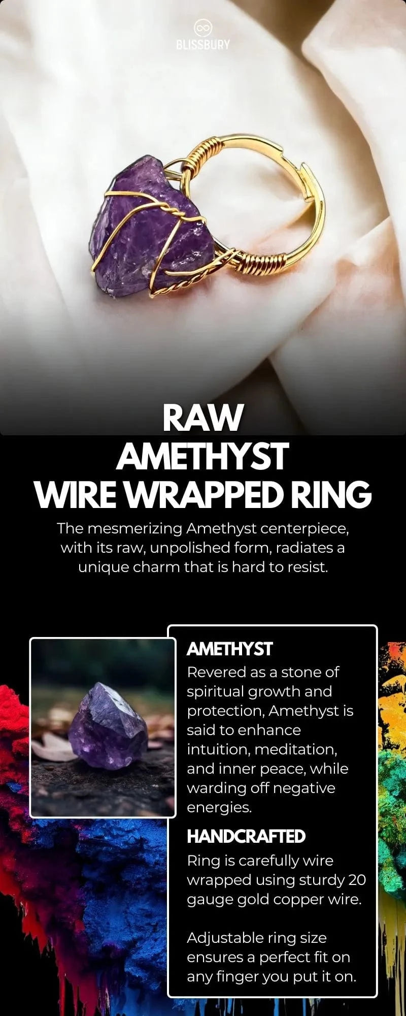 Présentation de la charmante bague enveloppée de fil d'améthyste brute, un accessoire à couper le souffle conçu pour ceux qui chérissent la beauté et l'énergie des pierres précieuses naturelles.