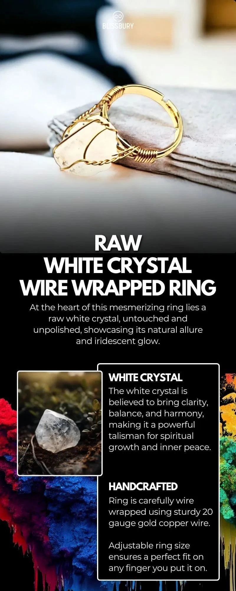 Avec la bague enveloppée de fil de cristal blanc brut, vous adopterez l'essence de la pureté et de l'élégance et découvrirez l'énergie transformatrice de cette pierre précieuse remarquable.